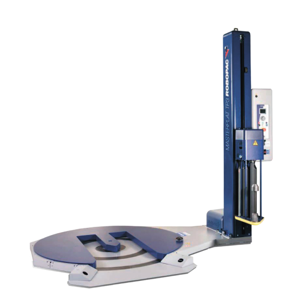 Полуавтоматический палетоупаковщик с поворотным столом Е-образной платформой, предназначенной для загрузки паллет для упаковки при помощи погрузчика. В модификации с кареткой PGS имеет функцию фиксированного предварительного растяжения плёнки на 250%.