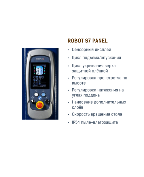 Полуавтоматический самоходный паллетообмотячик с опцией настраиваемого пре-стретча от 0 до 500% (каретка PVS), обрезания плёнки по окончанию цикла обмотки и регуляции натяжения на углах паллеты. Предназначен для использования на логистических складах, упаковывает товары цилиндрической и нестандартной формы. Уровеня заряда хватит на упаковку 250 паллет.